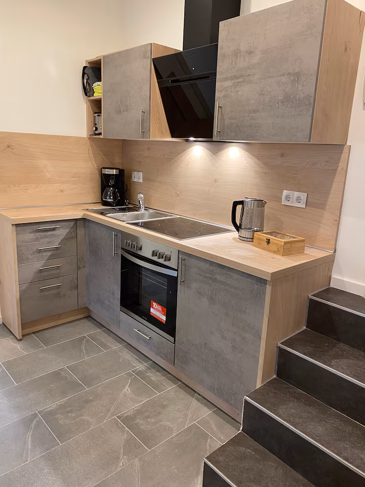 Die Ferienwohnung wurde frisch saniert und neu eingerichtet. Die Wohnung befindet sich im Erdgeschoss, man muss jedoch nach der Haustüre 4 Stufen und nach der Wohnungstüre gleich 5 Treppen abwärts steigen. Hier befindet sich die Küche, von hier aus geht es ins Schlafzimmer, Wohnzimmer und das Bad!