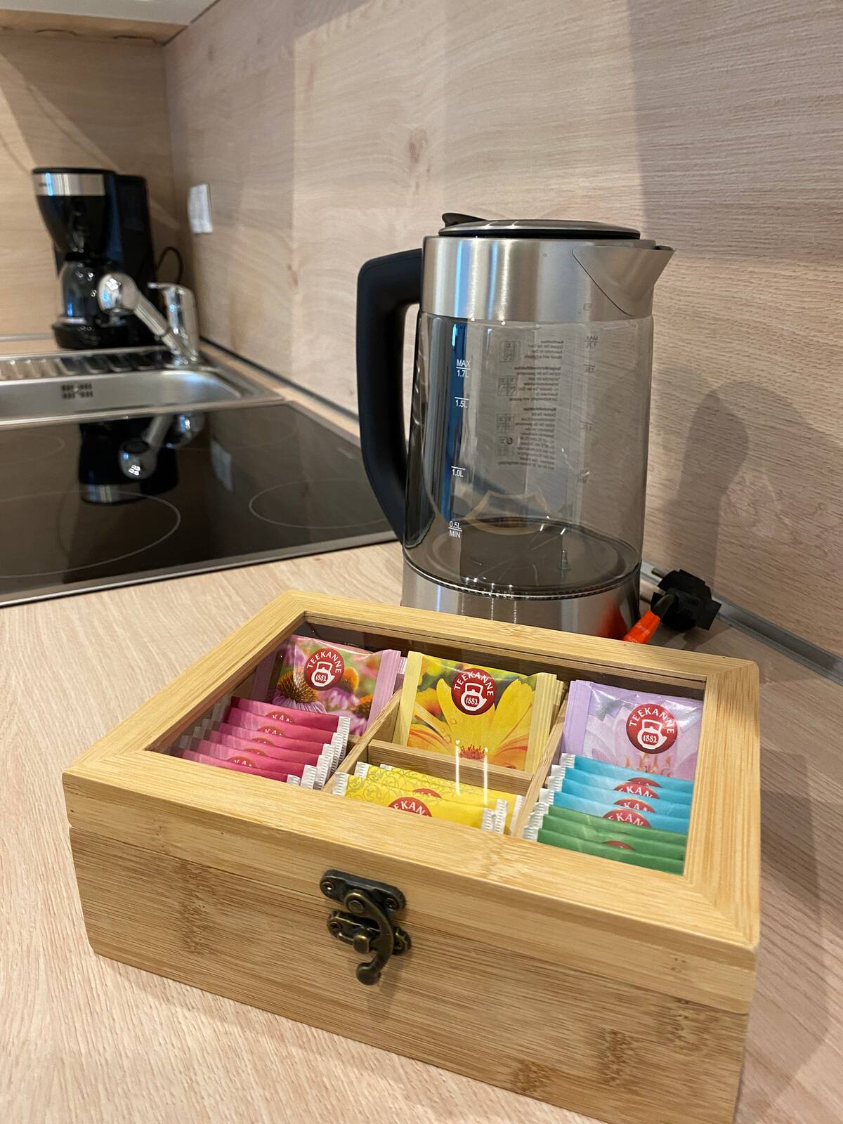 Es gibt einen Toaster, eine Teeauswahl, eine Kaffeemaschine, ich stelle Kaffeepulver und Kaffeefilter zur Verfügung. Außerdem sind Zewa, Seife, Toilettenpapier, Spülmittel, sämtliche Spüllappen, Alufolie, Frischhaltefolie, Backpapier vorhanden.